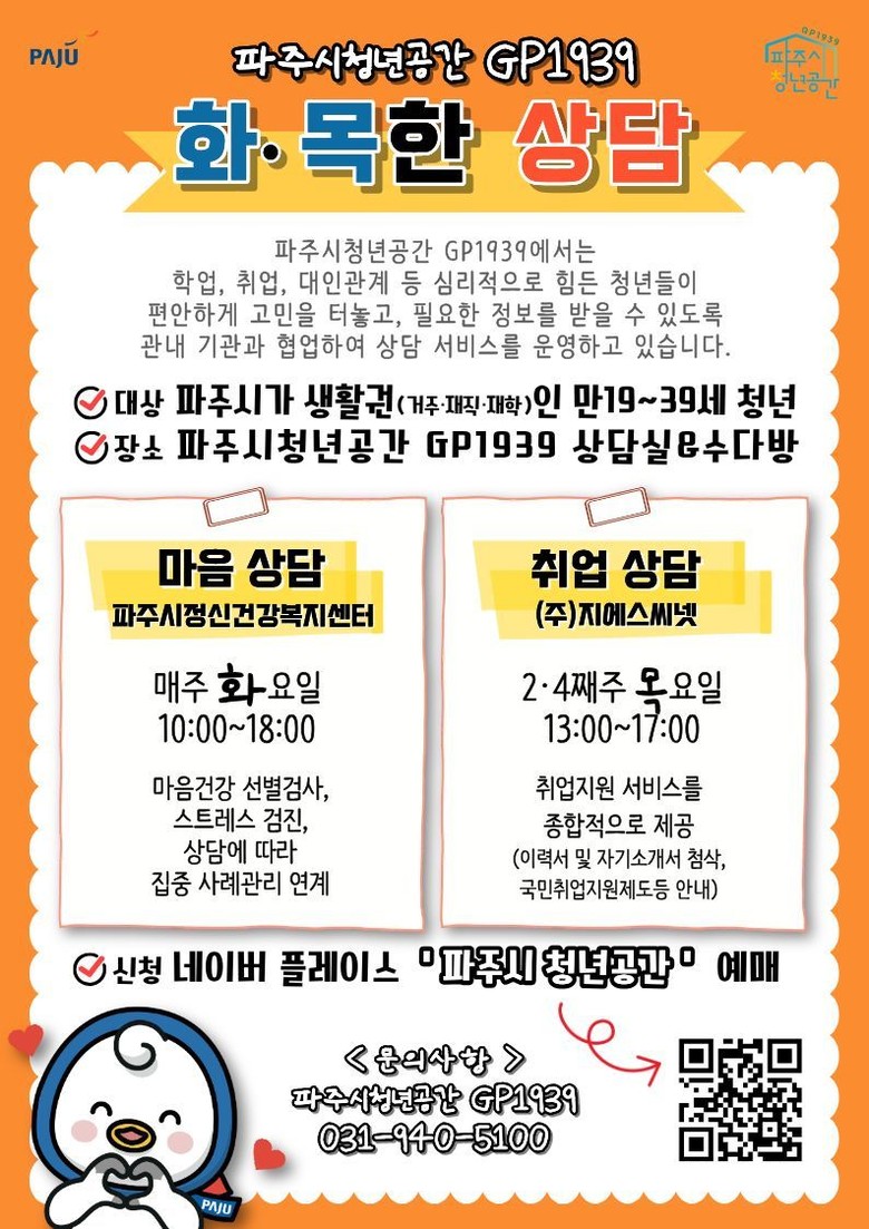 상담을 희망하는 청년은 파주시청년공간 지피(GP)1939 네이버플레이스를 통해 신청하거나, 파주시청년공간(☎031-940-5100)으로 문의하면 된다.