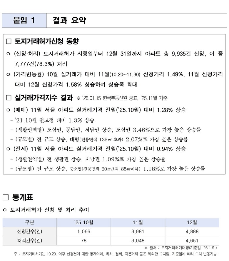 시는 10.15 대책 이후 제도적으로 큰 변화가 있는 서울 전역 토지거래허가 시행(’25.10.20.)과 관련해 ▴당월 토지거래허가 신청·처리 현황 ▴신청분의 가격 변동추이를 분석해 제공한다.
