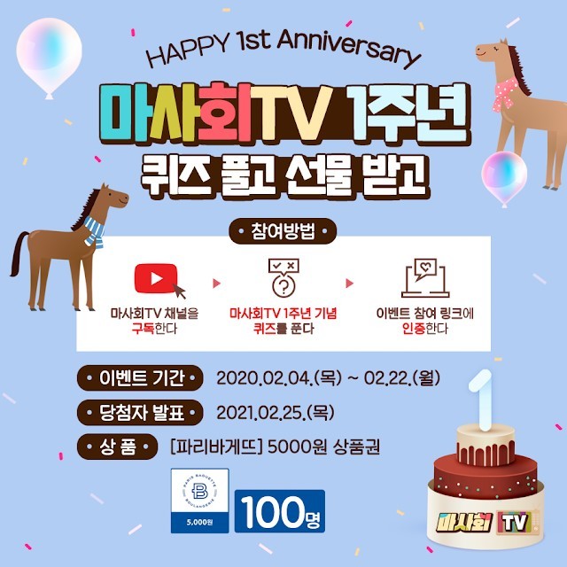 이에 한국마사회는 지난 1년간 마사회TV에 성원을 보내준 구독자들에게 감사의 마음을 전하기 위해 1주년 기념 특별한 이벤트를 마련했다. 참여 방법은 오는 22일까지 마사회TV 유튜브 채널에서 진행되는 퀴즈에 응모하고 마사회TV 채널 구독 인증을 하면 완료된다. 추첨을 통해 총 100명에게 제과 상품권을 증정할 예정이다. 이벤트와 관련한 자세한 내용은 한국마사회 유튜브 마사회TV 채널 커뮤니티에서 확인할 수 있다.