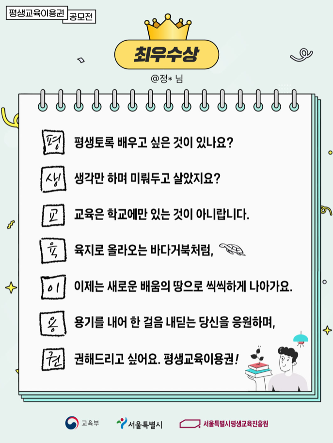 - 지난해 ‘평생교육이용권 우수사례 공모전’ 결과 담아 수기집, 1.13.(화)부터 누리집 공개