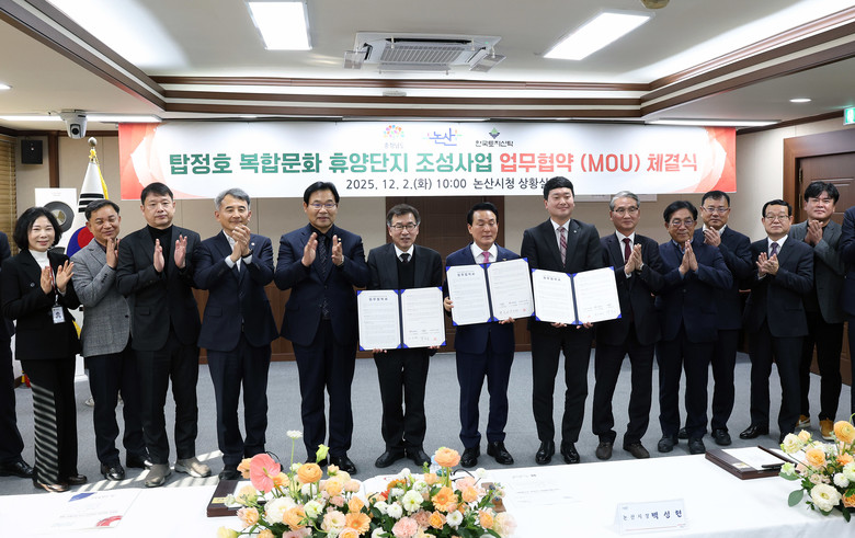 도는 2일 논산시청 상황실에서 전형식 도 정무부지사, 백성현 논산시장, 김정호 ㈜한국토지신탁 신탁사업2본부장이 ‘탑정호 복합문화 휴양단지 조성’ 업무협약을 체결했다고 밝혔다.