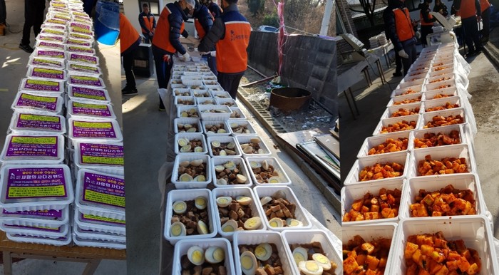 이날 밑반찬 봉사에는 추운날씨에도 불구하고 유희자 단장을 비롯한 회원 70명이 참석하여 돼지고기장조림, 동치미, 깍두기를 3가지를 만들고 배달하였다.