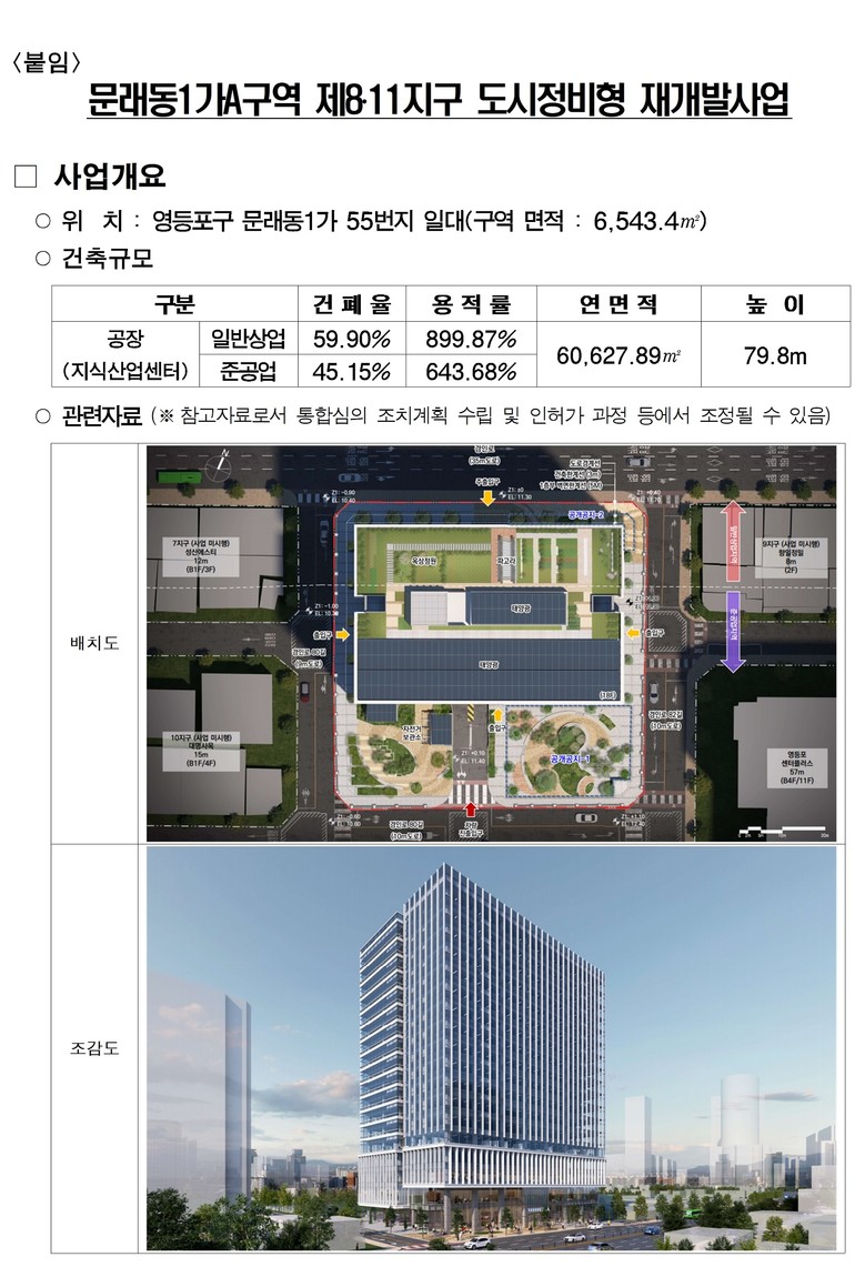 통합심의(안)은 정비계획에 따라 지하6층, 지상18층 규모의 지식산업센터 및 지원시설(근린생활시설, 업무시설)을 건립하여 서남권 산업벨트와 여의도 도심권 축을 잇는 산업기반시설로써 도시경제 활성화를 도모할 예정이다.