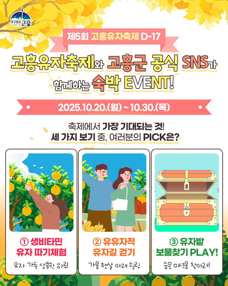 이번 이벤트는 제5회 고흥유자축제의 성공적인 개최와 고흥군 공식 SNS 활성화 및 전국의 관광객들이 고흥의 청정 자연과 맛있는 음식 등 다양하게 고흥을 즐길 수 있는 기회를 제공하기 위해 마련됐다. 참여자 중 14명을 추첨해 고흥 바다의 아름다운 오션뷰를 자랑하는 고흥썬밸리리조트 숙박권(조식 포함)을 증정한다.