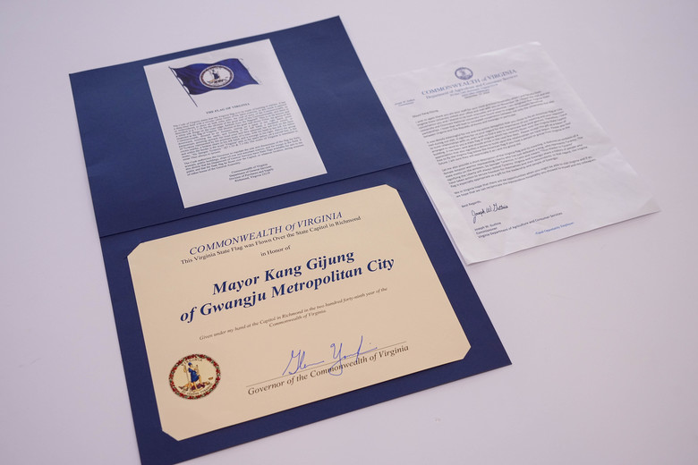 광주광역시(시장 강기정)는 최근 미국 버지니아주 글렌 영킨(Glenn Youngkin) 주지사가 친필 서명이 담긴 감사증서와 조셉 구스리 농업‧소비자서비스부 청장의 서한문, 버지니아주기를 보내왔다고 3일 밝혔다.
