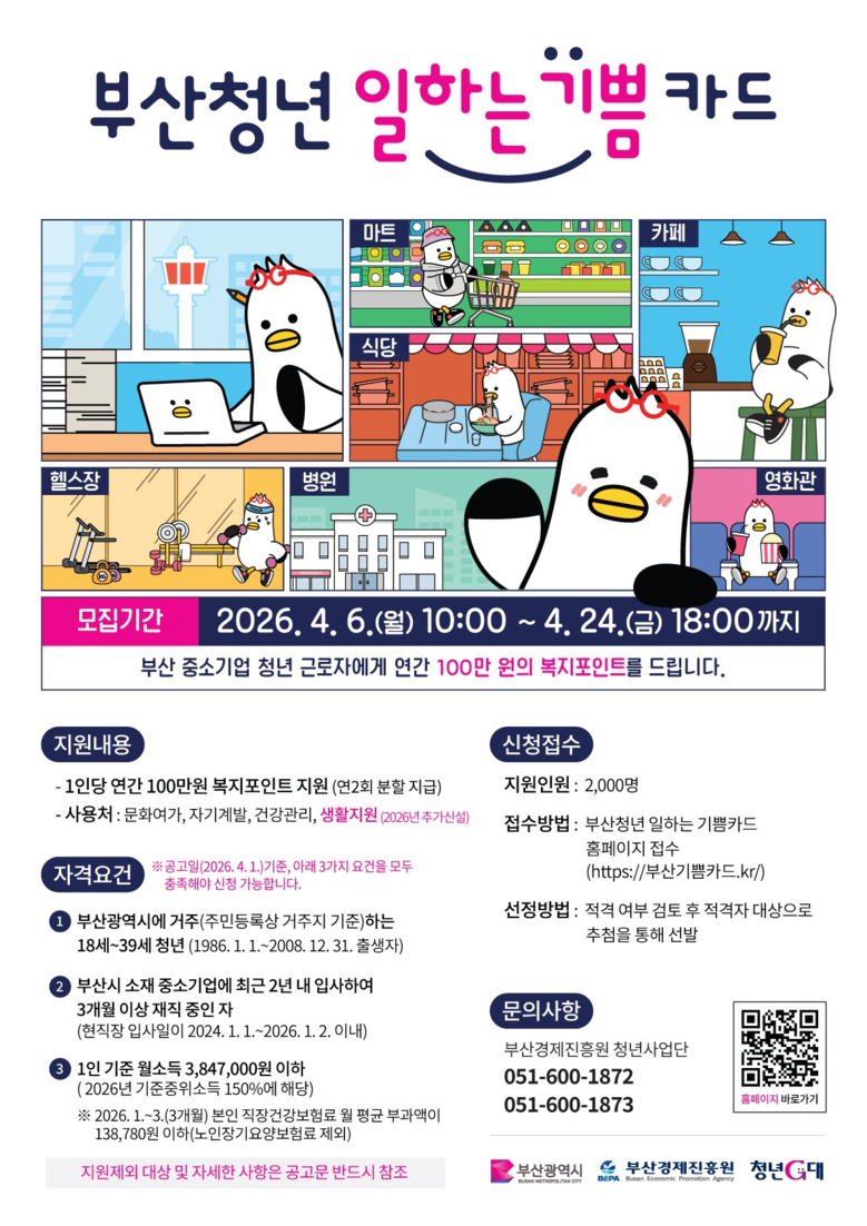 ◈ 중소기업 재직 청년의 복지수준 향상 및 취업 초기 안정적 정착을 응원하기 위한 '2026년 부산 청년 일하는 기쁨카드 지원' 대상자 2천 명 모집… 1인당 1백만 원 복지포인트 지원