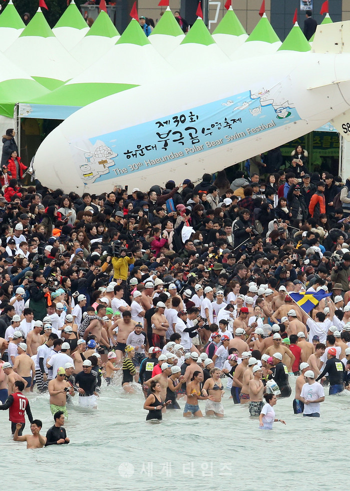 8일 부산 해운대해수욕장에서 열린 겨울 이색 스포츠 '제30회 북극곰 수영축제'에 참가한 시민과 관광객 등 5000여 명이 일제히 차가운 겨울바다에 뛰어들고 있다. 2017.01.08.
