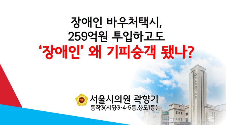 - 곽향기 의원, “바우처 택시 업무 지침 숙지 못해, 봉사료 받고도 장애인 대상 서비스 거부, 폭언 사례도 많아, 서울시 바우처 택시 사업 개선 대대적으로