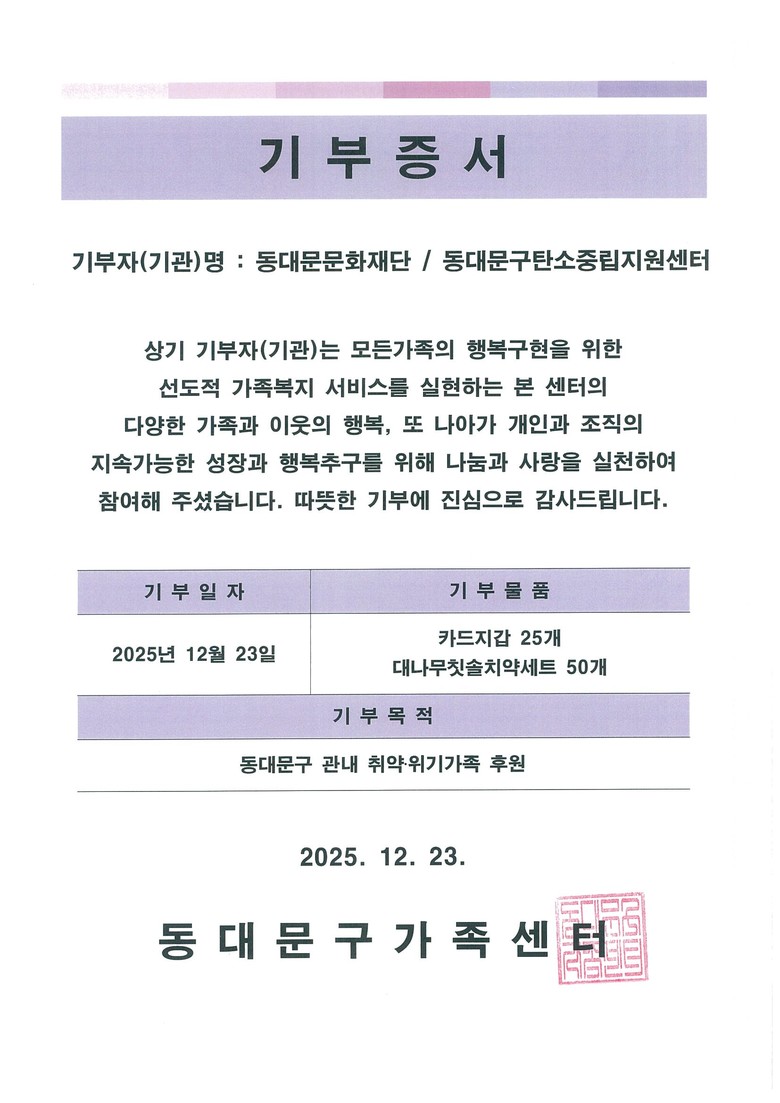 이번 업사이클링 체험은 일회성 행사에 그치지 않고, 지역사회와 함께하는 사회공헌 활동으로 이어졌다. 임직원이 직접 제작한 가죽 카드지갑은동대문구 관내 취약·위기 가정을 지원하기 위해 동대문구 가족센터에 기증되었으며, 이를 통해 지역사회 나눔 실천과 재단의 공익성 강화에도 기여했다.
