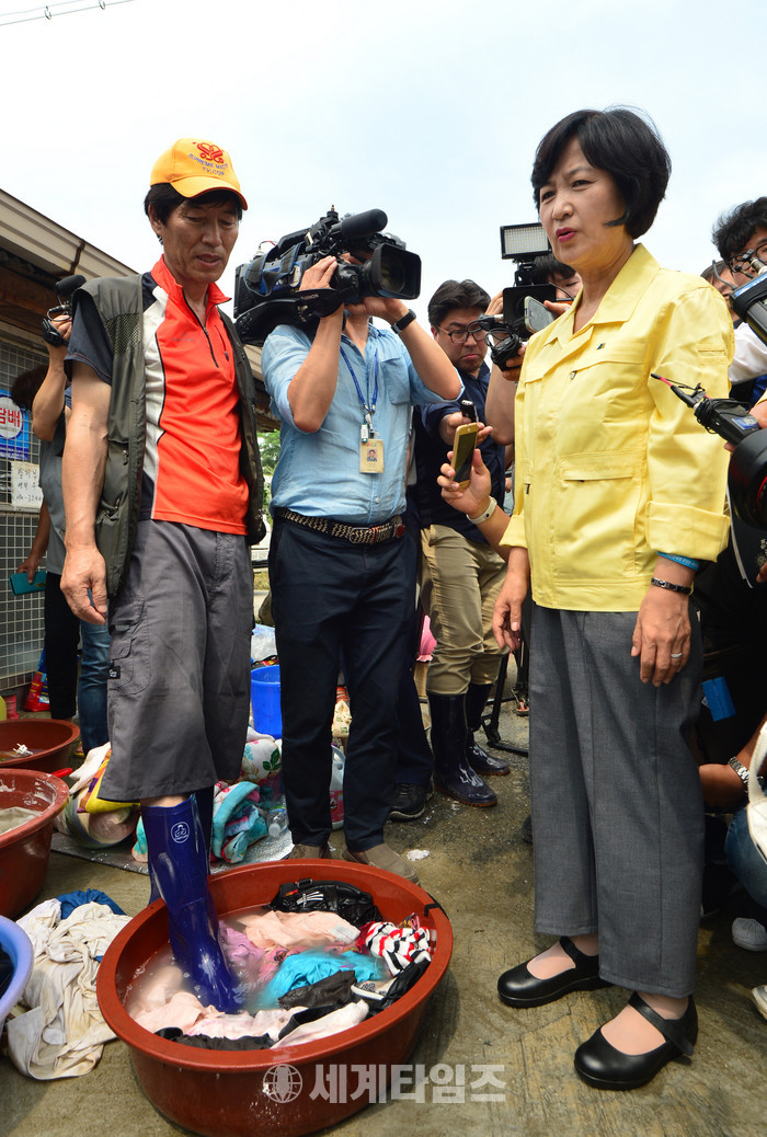 추 대표는 수해 현장에 대한 충북도 관계자와 청주시장의 브리핑을 들은 뒤 "요즘 같이 기상변화가 급격한 상태에서 예상치 못한 가움, 또 가뭄은 그대로 있으면서 (나타나는) 집중 호우 등 인력으로 해결되지 않을 특별재난을 당한 지역에 대해서는 총체적인 지원과 상시적인 대비, 긴장감 놓치지 않는 행정력이 필요하다"며 "덤프 장비 부족 등은 지방자치단체간 서로 연계해서 도울 수 있도록 행정자치부에 건의하겠다"고 답했다.