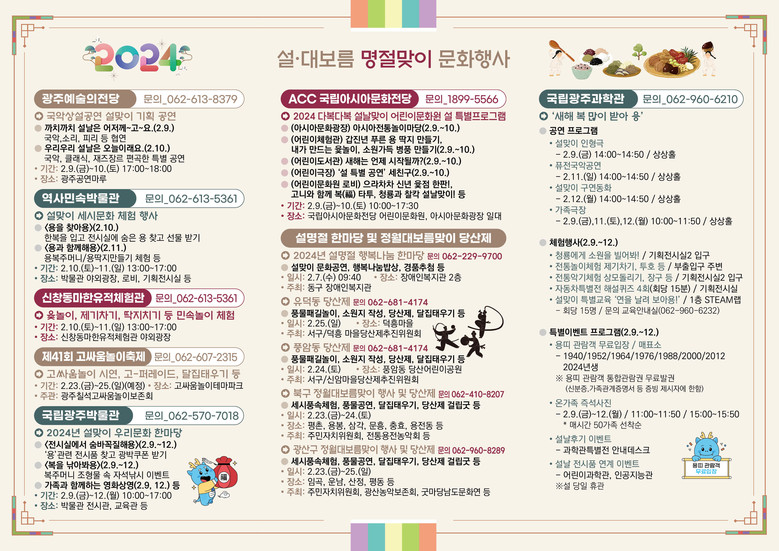 국립아시아문화전당 일원에서는 2024 다복다복 설날맞이 프로그램으로, 아시아 전통놀이마당, 갑진년 푸른 용 딱지 만들기, 으라차차 신년 윷점 한판!, 청룡과 찰칵 행사를 준비했다.