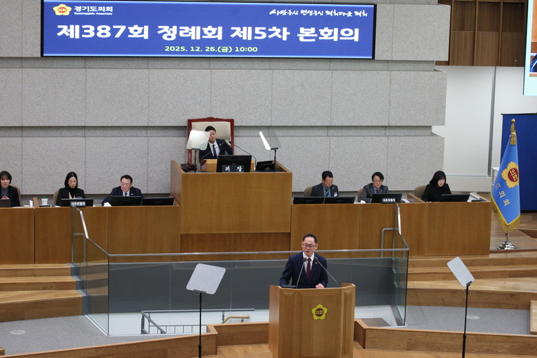 | ▲경기도의회 제387회 정례회 제5차 본회의에서 김완규 의원이 5분 자유발언을 실시하고 있다. |