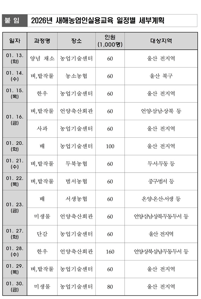 한편, 농업기술센터는 새해농업인실용교육 외에도 품목별 농업전문기술교육, 울산그린농업대학, 예비 농업인을 위한 귀농⋅귀촌 교육, 도시농업교육, 농기계 순회 수리교육, 생활자원 실습교육 등 다양한 교육을 연중 실시할 계획이다.