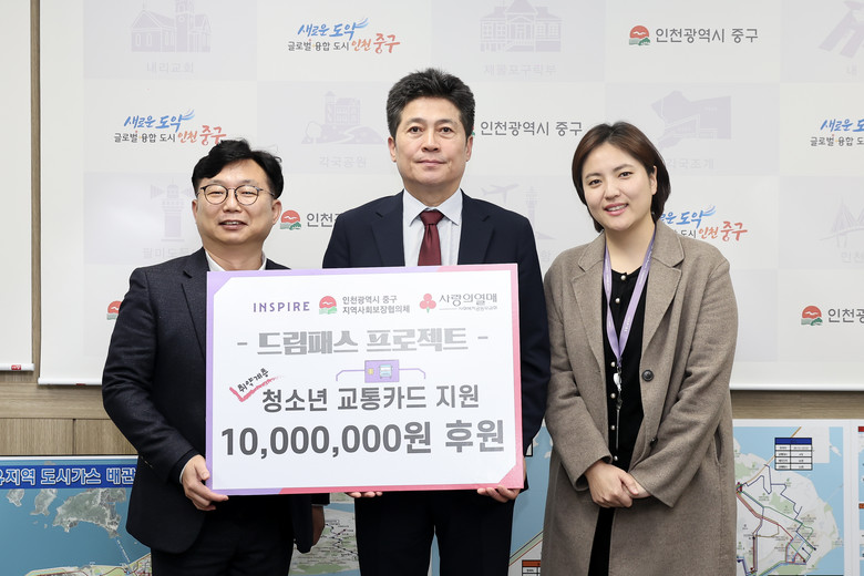 [중구 세계타임즈=심하린 기자] 인천시 중구(구청장 김정헌)는 최근 인스파이어 엔터테인먼트 리조트가 ‘중구 드림패스 프로젝트’를 위한 1,000만 원의 후원금을 기탁했다고 19일 밝혔다.