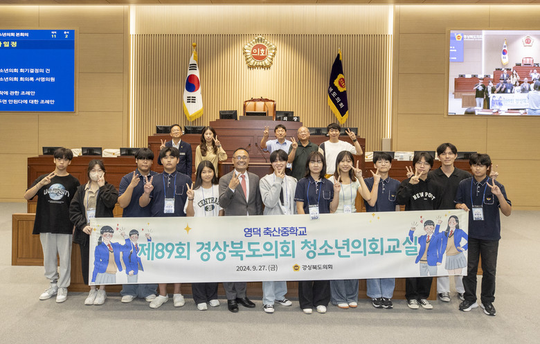 [경북 세계타임즈=한윤석 기자] 경상북도의회(의장 박성만)는 9월 27일(금) 본회의장에서 영덕 축산중학교 학생 11명이 참여한 가운데 「제89회 경상북도의회 청소년의회교실」을 개최했다.