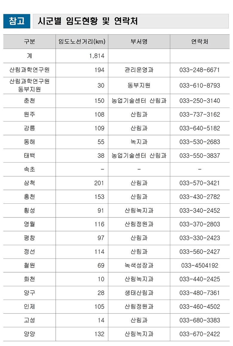 이번에 개방되는 임도는 도 사업소와 시군에서 관리 중인 지방임도 총 1,814km 구간이며, 폭설이나 결빙 등으로 안전사고 우려가 있는 일부 구간은 개방 대상에서 제외된다. 개방 여부 등 자세한 사항은 해당 시군 산림부서로 문의하면 된다.