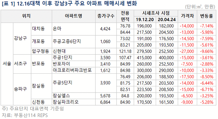 서울 강남3구는 최근 3개월 연속(2월 -0.02%, 3월 -0.17%, 4월 -0.63%) 떨어져 낙폭이 확대되고 있다. 정부 규제에 더해 코로나19가 동시에 겹친 결과다. 강남권에 위치한 주요 아파트단지의 시세 변화를 살펴보면 12.16 대책 이후 올해 4월까지 대부분 1억원가량 떨어진 것으로 확인된다. 강남권 재건축을 대표하는 대치동 은마아파트는 12.16대책 발표 이후 1억3,000만원-1억4,000만원 떨어지며 변동률 기준으로 6~7% 하락했다.
