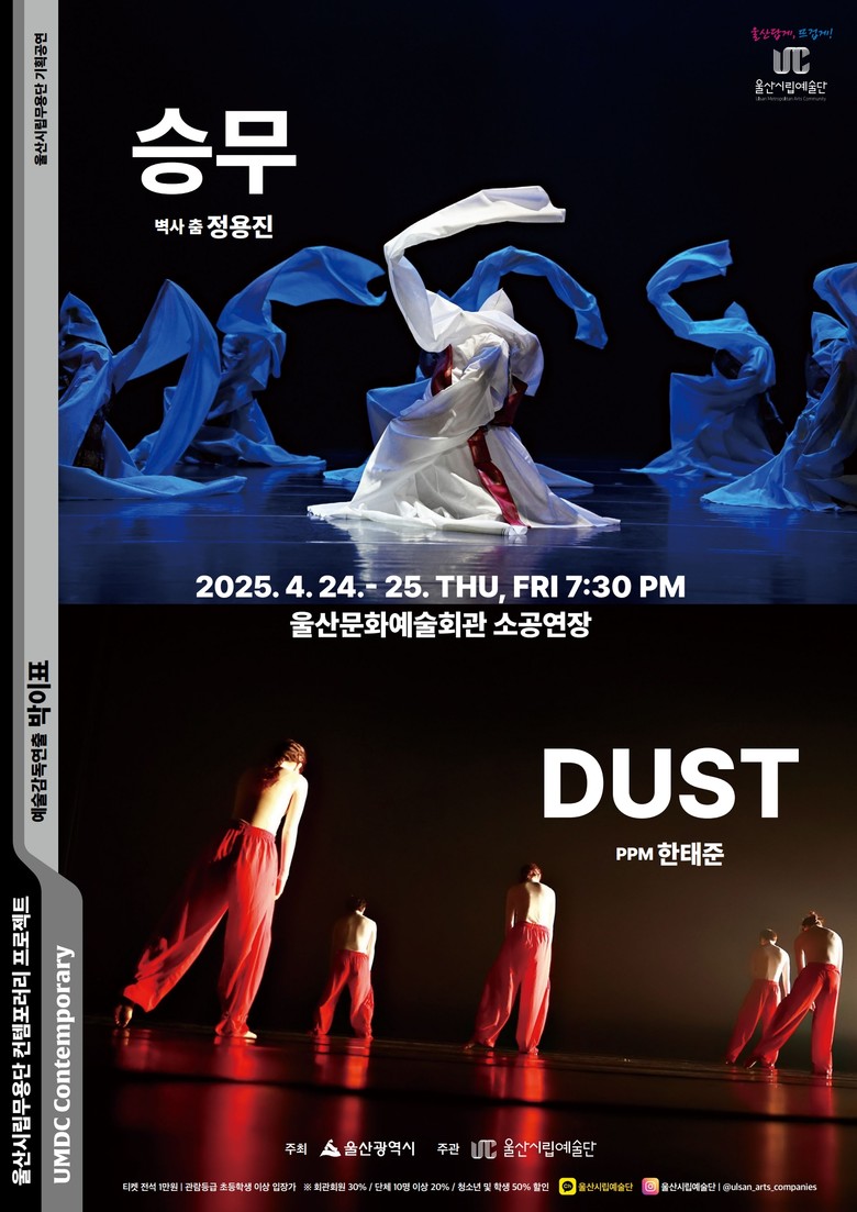 정용진‘벽사춤-승무’, 피피엠‘더스트’두 작품 동시 공연 [울산 세계타임즈=이현진 기자] 울산시립무용단이 4월 24일과 25일 양일간 오후 7시 30분 울산문화예술회관 소공연장에서 기획공연 ‘울산시립무용단 유엠디시(UMDC) 컨템포러리(UMDC Contemporary)’를 선보인다.