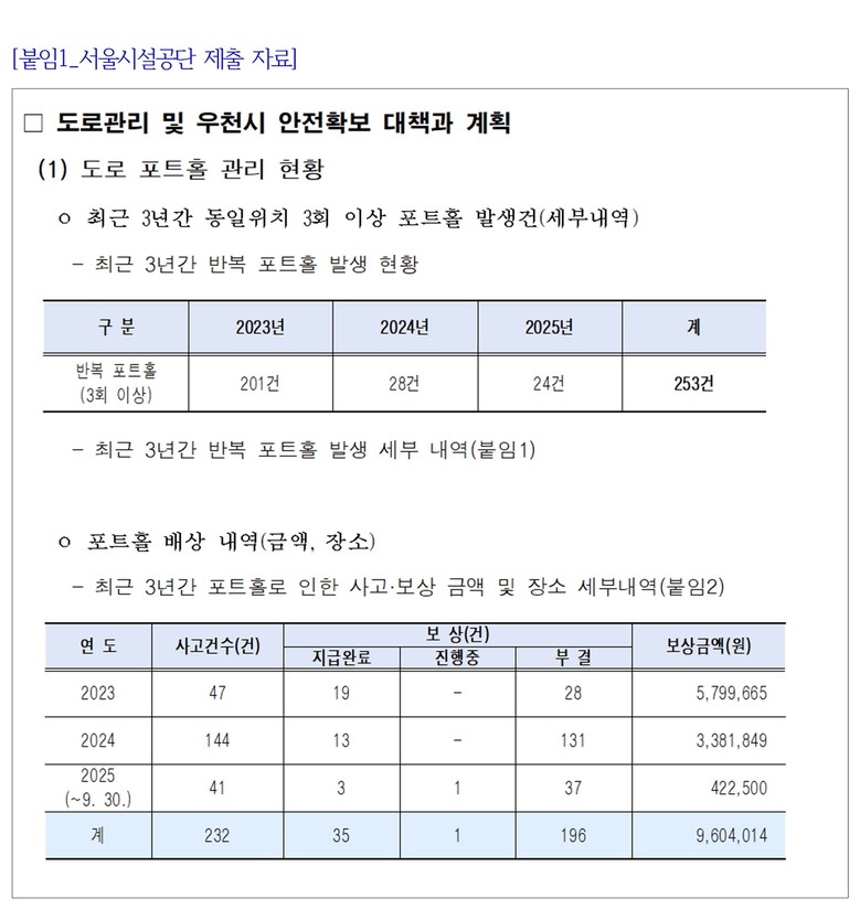 이 의원은 “서울시는 반복 다발 구간에 대한 정밀 조사와 함께, 배수·노면층 개선 및 예방 중심 유지관리 체계 전환을 서둘러야 한다”고 말했다.