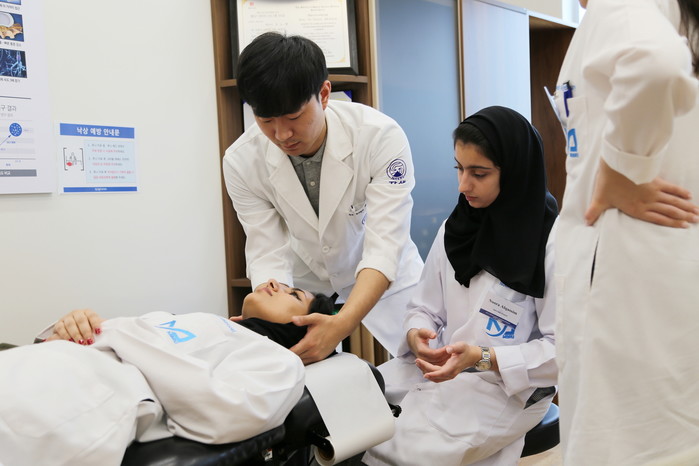 | ▲두바이 MBRU 의대생들이 자생한방병원 의료진에게 한방치료 교육을 받고 있다. |