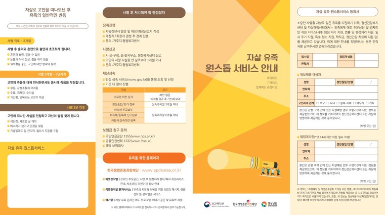 ‘자살유족 원스톱 서비스 지원사업’은 자살 유족이 갑작스러운 상실과 충격에서 벗어나 신속히 일상으로 복귀할 수 있도록 심리적 지원부터 특수청소비, 일시주거비, 학자금 등 경제적 지원까지 통합적으로 유족의 상황에 맞는 맞춤형 서비스를 제공한다.