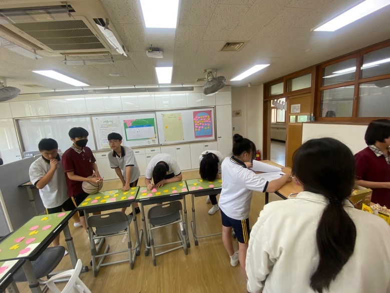먼저,“나에게 학교란” 활동을 통해 학생들은 자신이 느끼는 학교에 대해서 적어보고 선생님들과 공유하면서 서로의 생각을 알아가는 시간을 가졌다.