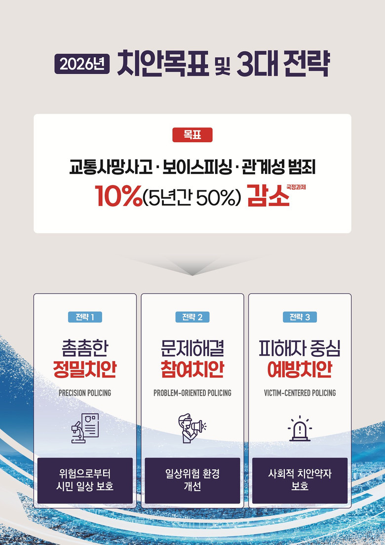 스쿨존 가변속도제, 무인단속장비 최적화, 범죄예방 환경설계(이하 셉테드,CPTED) 확대 등을 중심축으로 시민이 체감하는 골목·생활도로·주거지 안전을 동시에 높이는 ‘입체적 일상보호 모델’을 구축한다는 구상이다.