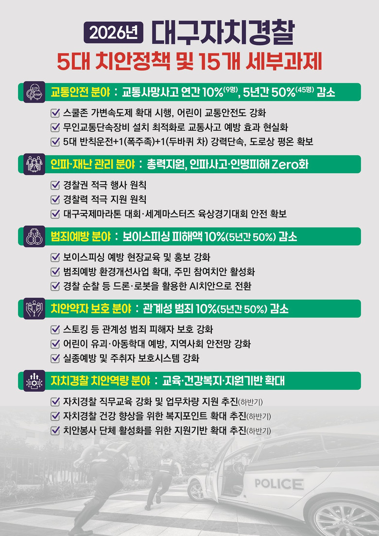 ▸ 시민과 함께 ‘집 앞부터 안심되는 대구’ 만들기에 매진 [대구 세계타임즈=한윤석 기자] 대구자치경찰위원회(위원장 이중구)는 2026년을 ‘시민과 함께 만드는 일상안전의 해’로 정하고, 교통안전·인파·범죄예방·치안약자 보호·치안역량 강화 등 5대 정책 분야 및 15개 세부 과제를 추진해 나갈 계획이다.