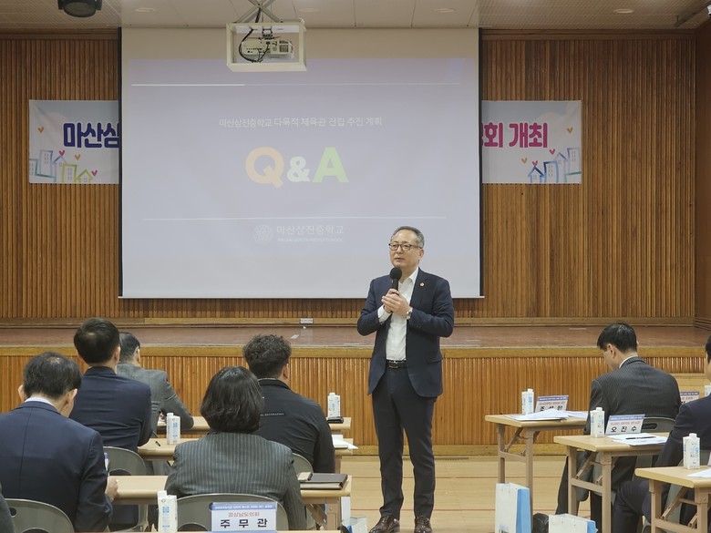 [경남 세계타임즈=최성룡 기자] 경남도의회 교육위원회 정규헌 의원(국민의힘, 창원 9)이 7일(금), 마산삼진중학교에서 학생 체육 교육 활동 운영 등을 위한 다목적 강당 건립을 위한 설명회를 개최하였다.