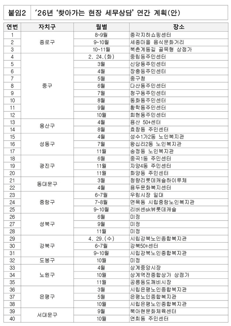 - 전통시장, 50+센터 등 소상공인 세무상담으로 민생경제 지원할 터 [서울 세계타임즈=이장성 기자] 서울시는 금년 들어 시민 생활현장에서 바로 상담받을 수 있는 ‘찾아가는 현장 세무상담’을 2월 24일(화)에 개시했다. 2026년에는 연간 75회 규모로 대폭 확대하고, 25개 자치구별로 최소 3회 이상을 목표로 현장 상담을 실시할 예정이다.