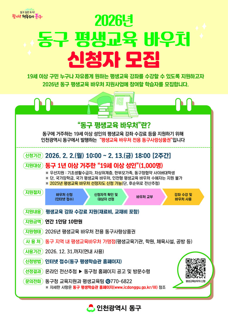 신청대상은 공고일 기준 주민등록상 주소가 1년 이상 동구로 등록된 19세 이상 성인이면 누구나 신청 가능하며, 기초생활수급자, 차상위계층, 한부모가족, 동구청 협약 사이버대학교 재학생을 우선적으로 지원한다. 다만 국가장학금, 국가 평생교육 바우처, 인천형 평생교육 바우처 수혜자는 지원대상에서 제외된다.