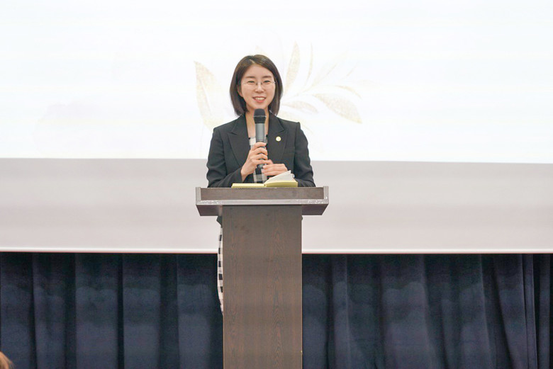 | ▲ ㈔세계여성평화그룹(IWPG) 전나영 신임 대표가 1일 서울 스페이스쉐어 서울중부센터에서 열린 대표이사 이·취임식에서 취임사를 하고 있다. [사진제공=IWPG] |