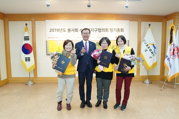 [수성구=세계타임즈 한성국 기자] 수성구의회 김희섭 의장은 지난 25일 수성구청 2층 회의실에서 개최된 ‘대한적십자봉사회 대구수성구지구협의회 2019년 정기총회’에 참석, 적십자 특별회비 100만원을 전달하고 지역사회 사랑나눔 봉사 활성화에 기여한 유공자 3명에게 표창을 수여하였다.