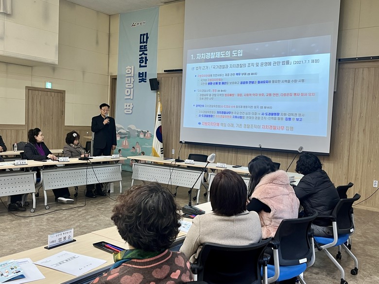 아산 온양1동 통장협의회 등 30명을 대상으로 한 이번 교육에선 김영배 위원회 사무국장이 자치경찰제도의 도입 취지와 필요성을 안내하고 범죄 예방과 여성·청소년, 교통 분야 등 자치경찰의 주요 역할을 실제 사례 중심으로 풀어 설명했다.