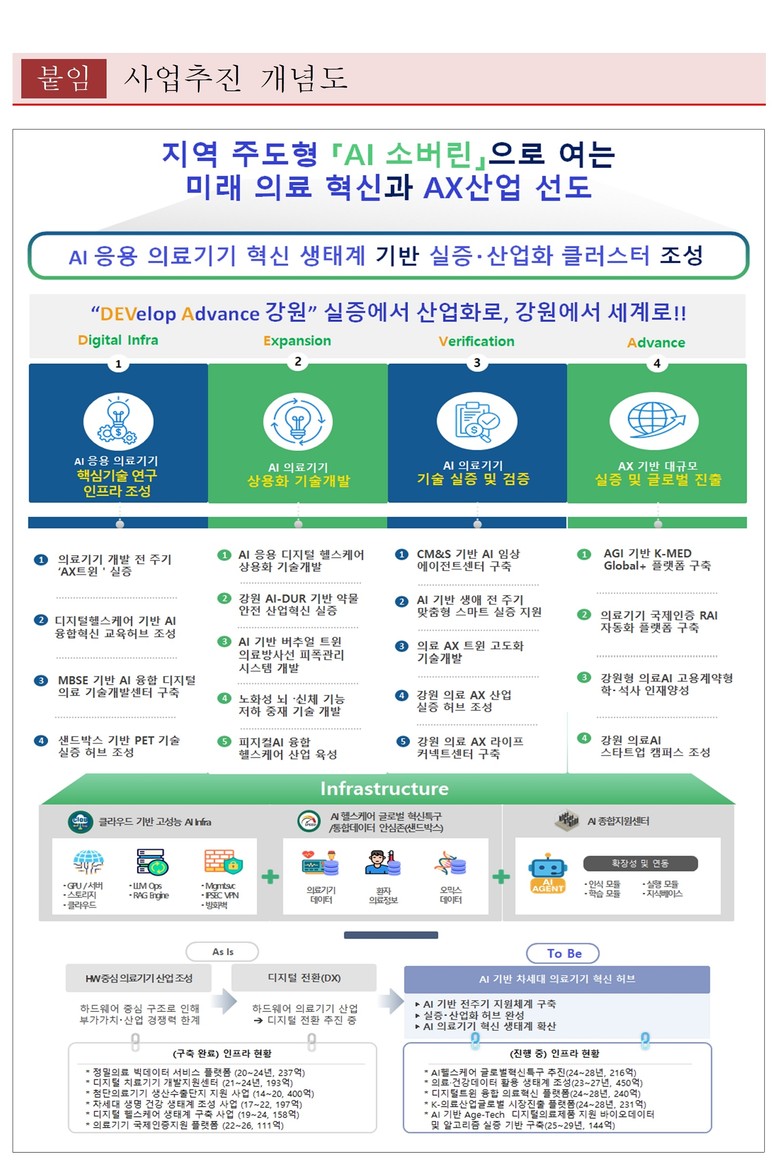 이번 사업은 새 정부의 ‘인공지능(AI) 대전환·초혁신경제 선도프로젝트’ 및 ‘5극 3특’ 초광역 성장엔진 전략에 대응하는 것으로, 강원권 성장엔진 후보 산업인 바이오와 연계하여 인공지능(AI) 의료기기 산업을 강원의 새로운 성장동력으로 육성하는 데 목적이 있다.