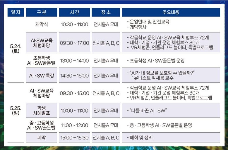 ‘AI·SW 골든벨’은 24일 13시 초등학생, 25일 11시에 중·고등학생을 대상으로 진행되며, 퀴즈를 통해 AI·SW 관련 지식을 겨룬다.