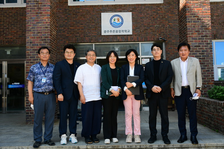 이후 방문한 광주푸른꿈창작학교에서는 학과 · 교육과정운영현황 및 향후 운영계획 등을 보고 받고 대안진로직업 전문교육과정이 이루어지고 있는 무용실습실, 사진실습실, 제과제빵실습실 등을 둘러보았다.