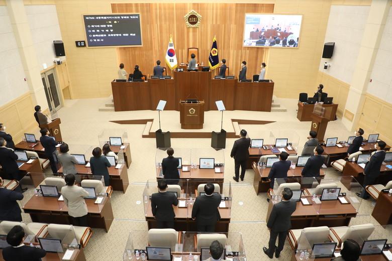 제79회 정례회 1차 본회의에서는 유인호‧김동빈‧김재형‧여미전‧김충식 의원의 5분 자유발언에 이어 내년도 본예산안 제출에 따른 시정연설 등 8개 안건을 처리했다.