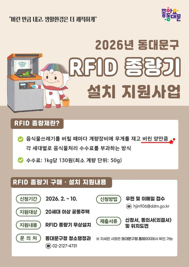 [동대문구 세계타임즈=이장성 기자] 동대문구(구청장 이필형)는 음식물류 폐기물을 줄이고 쾌적한 주거환경을 만들기 위해 ‘2026년 공동주택 음식물 쓰레기 RFID 종량기 설치 지원 사업’을 확대 추진한다.