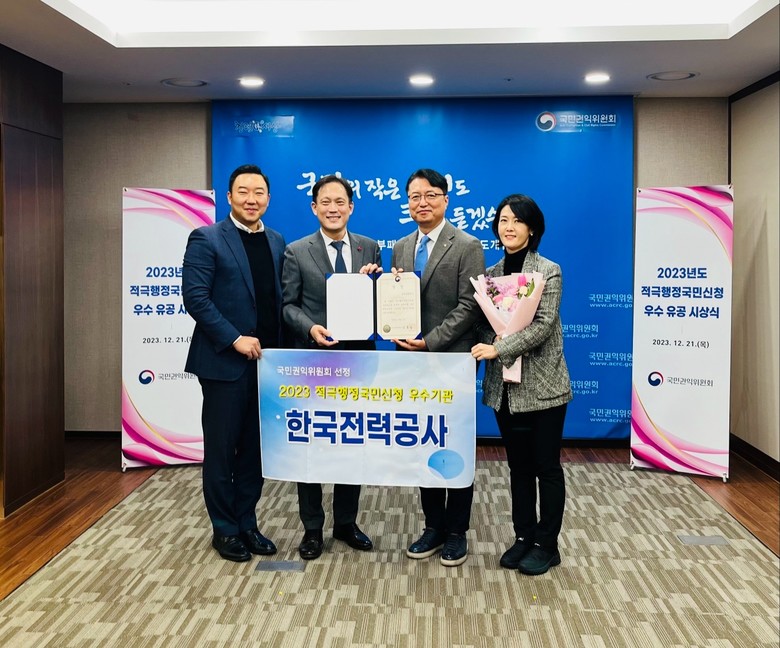 [세계타임즈 = 이영진 기자] 한국전력공사(사장 김동철, 상임감사위원 전영상)는 21일(목) 국민권익위원회에서 주최하는 ‘2023년도 적극행정국민신청 유공’ 시상식에서 ‘우수기관’ 및 ‘우수직원(감사실 심지은 차장)’ 2개 부문에서 국민권익위원장상을 수상하였다.