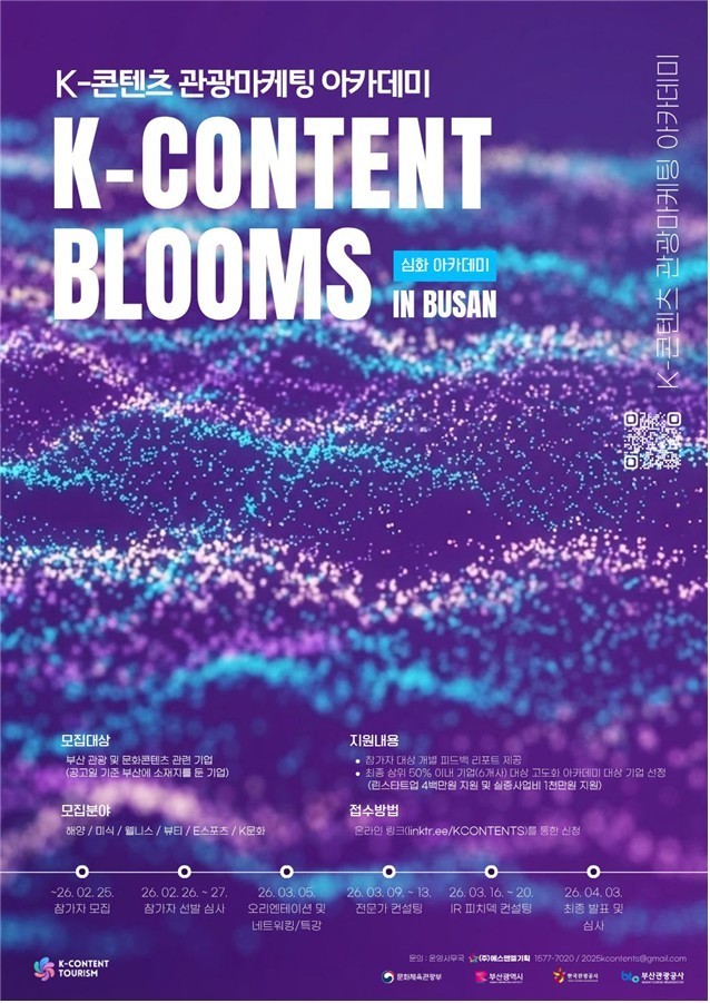 ◈ ▲해양 ▲미식 ▲치유(웰니스) ▲미용(뷰티) ▲이(E)-스포츠 ▲케이(K)-문화 등 총 6개 중점 분야에서 관광 콘텐츠 역량 강화… 전문가 진단, 멘토링, 투자 유치 발표 등 [세계타임즈=부산 이용우 기자] 부산시(시장 박형준)와 부산관광공사(사장 이정실)는 부산관광기업지원센터(센터장 김문준, 이하 센터)가 지역 관광산업의 체질을 혁신하고 글로벌 관광시장을 선점하기 위한 「케이(K)-콘텐츠 관광마케팅 아카데미」 기초과정을 성공적으로 마무리하고, 오는 2월 25일까지 심화과정 교육생을 모집한다고 밝혔다.