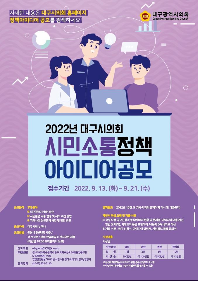 [대구 세계타임즈=한성국 기자] 제9대 대구광역시의회(의장 이만규)는 대구 시민을 대상으로 ‘시민소통 정책아이디어 공모전’을 추진하여 오는 9월 13일(화)부터 9월 21일(수)까지 아이디어 접수를 진행한다.