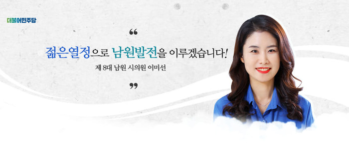 끝으로 이 의원은 이러한 여러 활동들을 하면서 “섬세하게 시민의 삶 속으로... 시민과 함께 걷겠습니다”라고 말하며, “더욱 행복한 남원을 위해 뛰고 또 뛰겠다”는 각오를 다졌다.