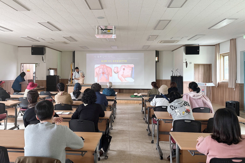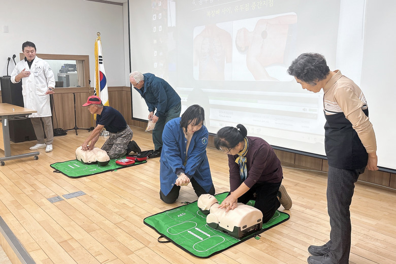 교육 참석자들은 심폐소생술 실습용 마네킹과 AED 모형기를 활용해 실제 응급상황을 가정한 훈련에 참여했으며, 강사들은 주민 눈높이에 맞춘 단계별 지도로 누구나 쉽게 이해하고 실천할 수 있는 응급처치 교육을 진행했다.