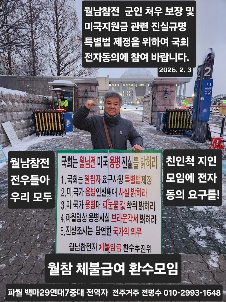 국가 공권력의 최대 피해자 월남 참전 유공자들은 작년 2025년 7월 7일부터 3일간 피켓 시위 호소문 2천 매를 인쇄하여 정부서울사무소, 용산 대통령 집무소, 국방부, 외교부 국회 정문에서 배포한 바 공직 책임자들이 읽고 책임을 통감하고 월남 참전자들 숙원 사항을 해결에 앞장서 주시길 간곡히 원합니다.