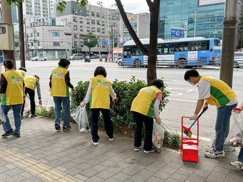 | ▲ 지난 21일 신천지자원봉사단 동작지부가 여의대방로 일대에서 거리 청소 봉사 활동을 진행한 가운데 자원봉사자들이 대림사거리 인근에서 쓰레기를 수거하고 있다. [사진제공 = 신천지자원봉사단 동작지부] |