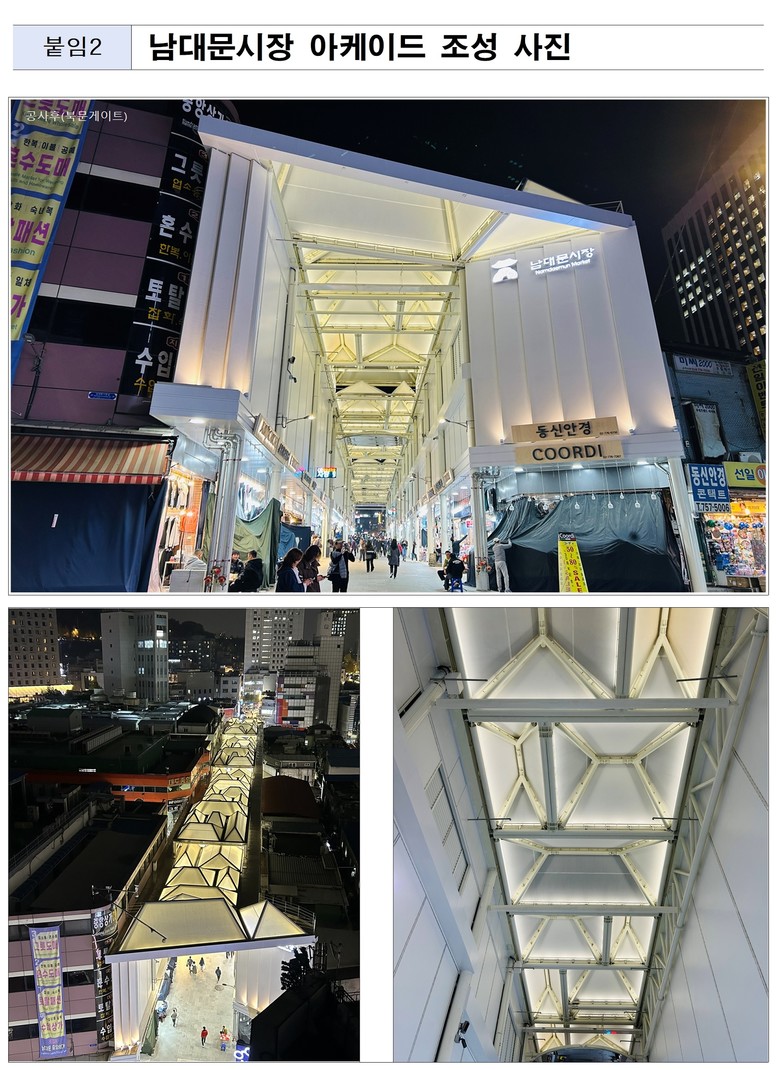 한편 서울시는 17일(월) 오전 10시 30분「남대문시장 일대 혁신 프로젝트」1호 결과물인 ‘아케이드 준공식’을 개최했다. 이날 준공식에는 오세훈 서울시장을 비롯해 중구청장, 시장 상인회, 중구 주민 등 160여 명이 참석한 가운데 남대문시장의 도약을 알린다.