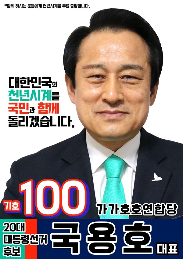 1일 가가호호연합당 국용호 대표는 브리핑을 통해 "많은 고민 끝에 제 20대 대통령선거에 출마하기로 했다"며 "당선된다면 국민 모두에게 천년을 함께할 천년시계를 지급하겠다"고 출마 포부를 밝혔다.