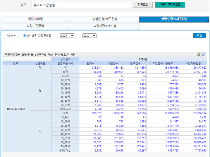 2020년 류마티스 관절염 환자는 24만 여명이었다. 건강보험심사평가원 통계에 의하면 50대와 60대 여성 환자가 전체의 42.9%를 차지하고 있었다. 손가락 마디가 두꺼워지는 등의 관절의 변형으로 인해 30대~40대 여성들도 병원을 많이 찾는다.