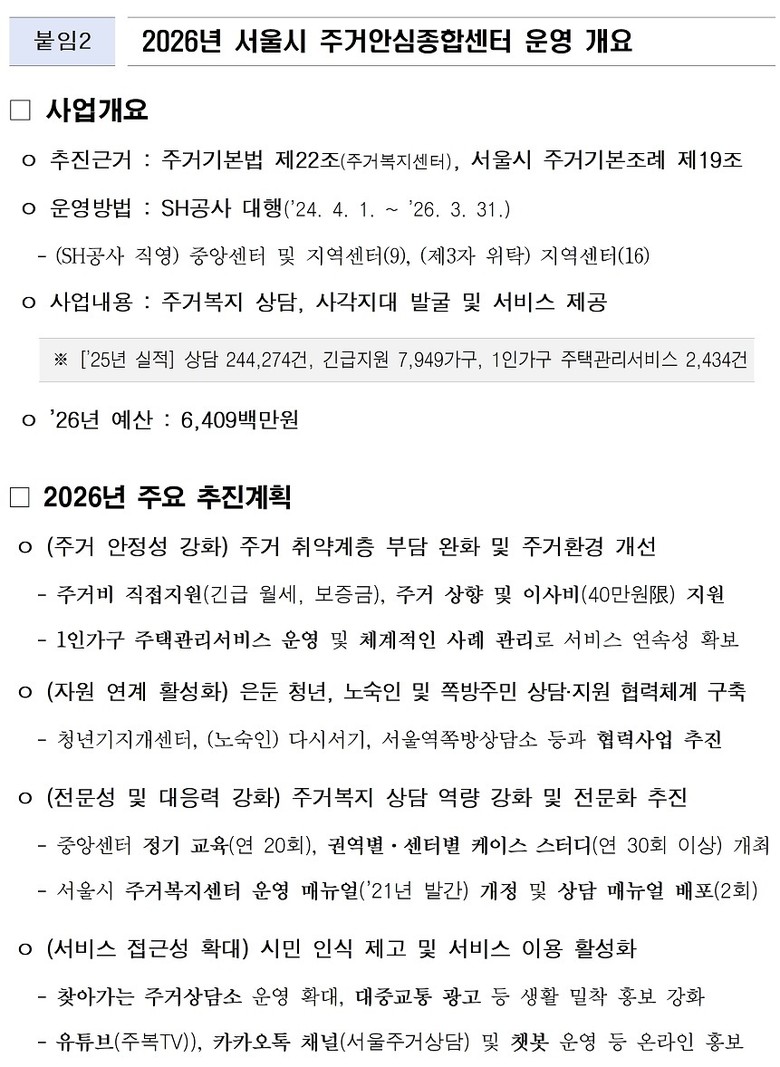 상담 외에도 실직·질병 등 갑작스러운 위기로 긴급 지원이 필요한 시민에 대한 ▴긴급주거비 ▴연료(난방)비 ▴간편 집수리 비용 등 ‘긴급 주거지원’도 가동 중이다.